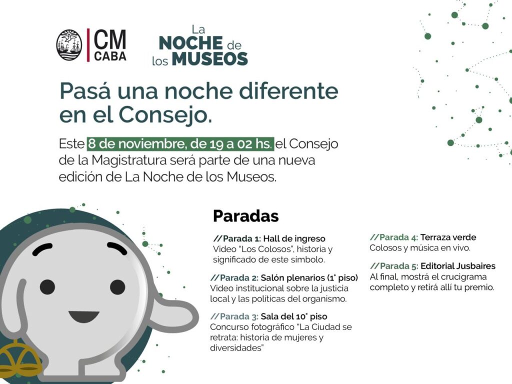 El Consejo de la Magistratura de la Ciudad de Buenos Aires participará el próximo 8 de noviembre en una nueva edición de “La Noche de los Museos” con un recorrido que consiste en cinco paradas por el edificio emblemático de “Los Colosos”.