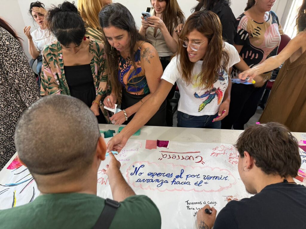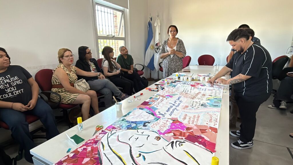 Como parte del encuentro se realizó una actividad artística en la que se plasmaron deseos y frases sobre la imagen de Lohana Berkins. Una vez finalizada, se colgó el mural dentro de la sede para seguir reflexionando sobre los derechos de las personas travestis y trans.